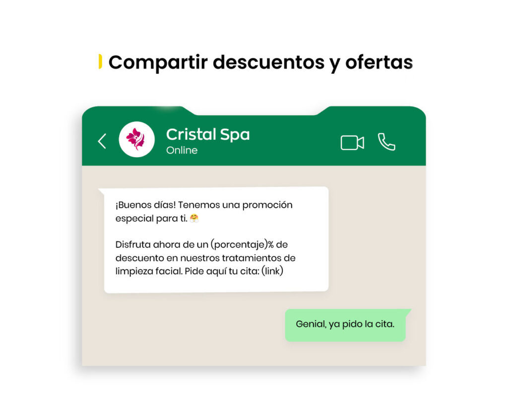 La automatización de WhatsApp puede servir para compartir descuentos y ofertas con los clientes, estos mensajes son conocidos como promocionales y ayudan a impulsar las ventas. Aquí hay ejemplo de cómo un spa utiliza estos mensajes: