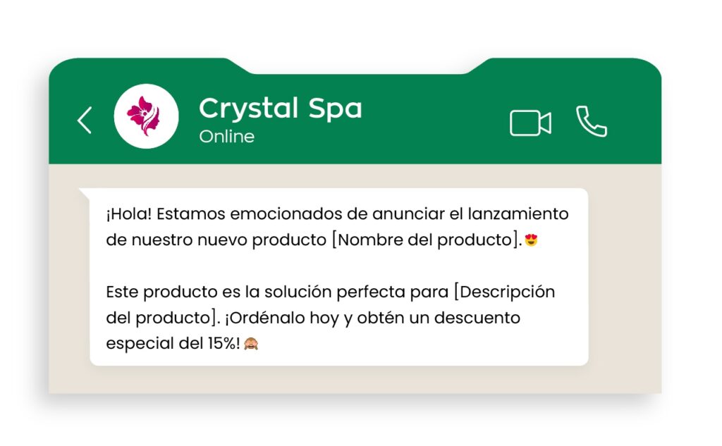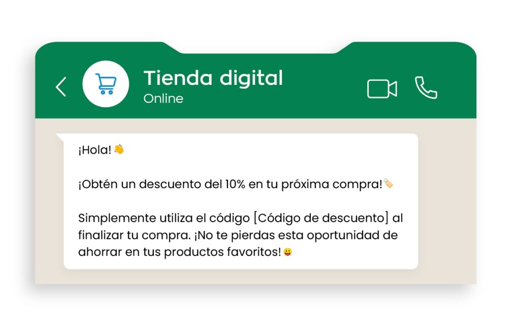 5. Aquí está el contenido que debemos escribir de nuestra plantilla. Como seleccioné el tipo texto, este sería mi ejemplo: “Hola, ¡El verano está a la vista! ☀️ Obtén un 15% de descuento en todos nuestros productos. ? Visítanos en nuestra web y haz tu pedido usando el código . ¡No te pierdas esta oferta única! ❣️”