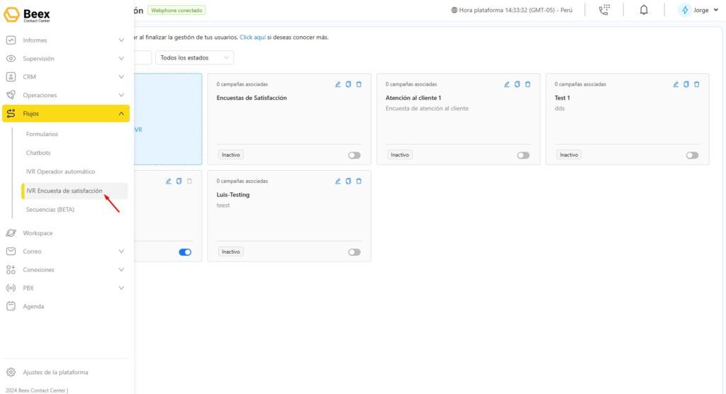 En el menú lateral izquierdo, selecciona Flujos y luego haz clic en IVR Encuesta de satisfacción.