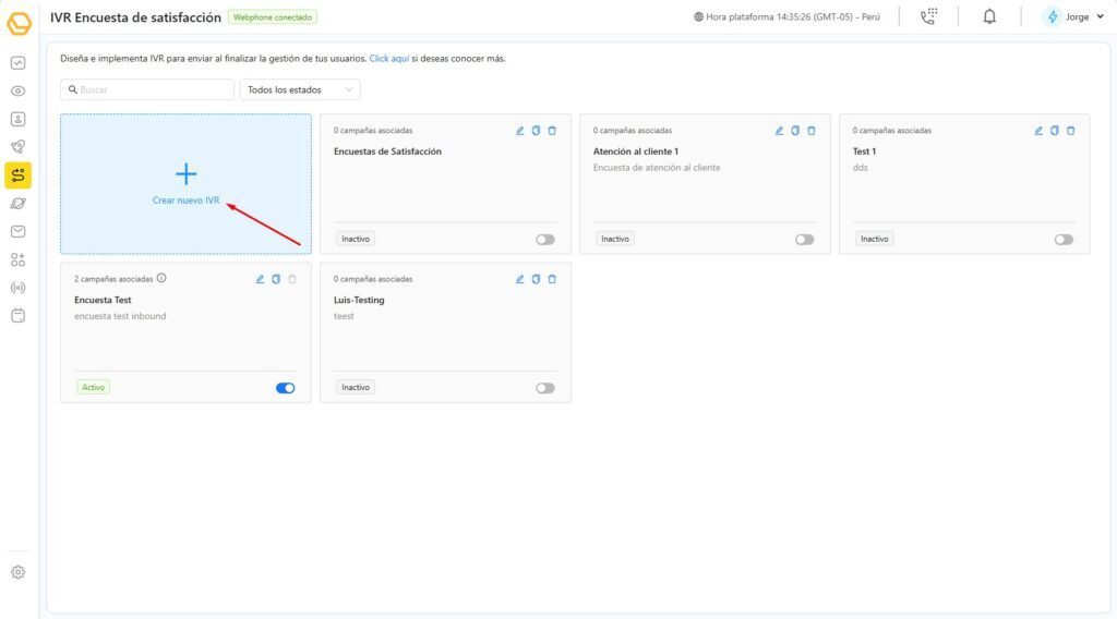 En la pantalla de IVR Encuesta de satisfacción, haz clic en el botón Crear nuevo IVR.