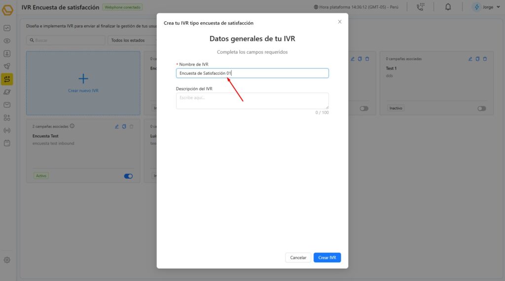 Se abrirá una ventana donde debes asignar un Nombre al IVR (por ejemplo, "Encuesta de Satisfacción 01") y, opcionalmente, una Descripción para identificarlo. Luego, haz clic en Crear IVR.