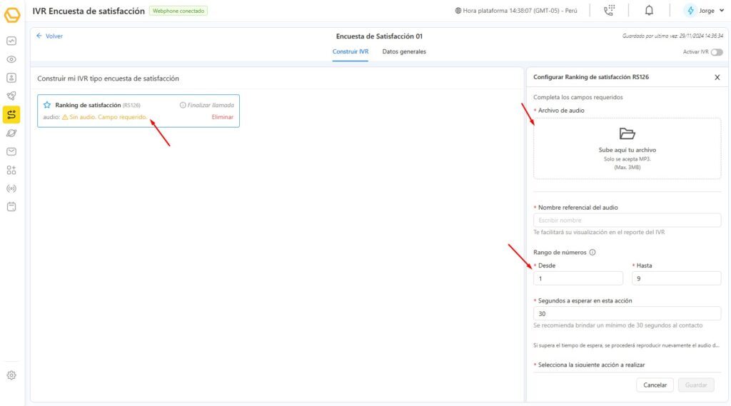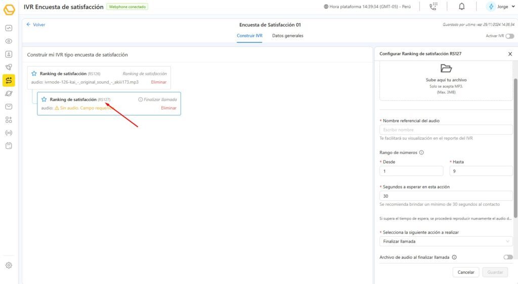 En la pantalla de edición del IVR, selecciona la opción Agregar encuesta de satisfacción.