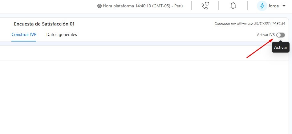 Regresa a la pantalla principal de configuración del IVR y activa el interruptor en la esquina superior derecha para poner el IVR en estado Activo.