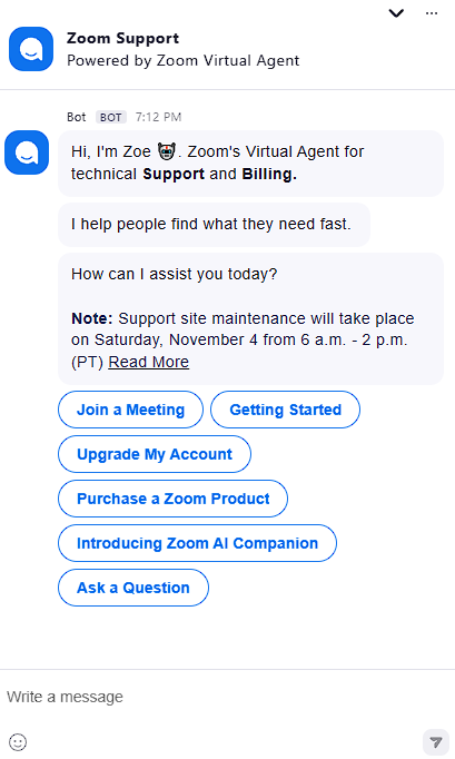 Otra forma ingeniosa para sacarle el jugo a los chatbots es crear una lista de las consultas más frecuentes de tus servicios. Esto hace que la atención sea más precisa y oportuna. ¿Qué empresa aplica con maestría esta táctica? Hay muchas, entre ellas Zoom.