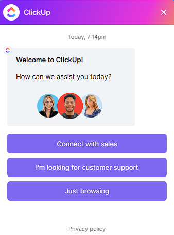 Usa el chatbot para brindar asistencia de soporte técnico. De esta forma, guías al cliente en la resolución de problemas. ClickUp destaca en esta táctica. Cuando pides contactarte con el área de soporte por el chat te remite al centro de ayuda donde encontrarás varios artículos que tratan diversas consultas frecuentes.