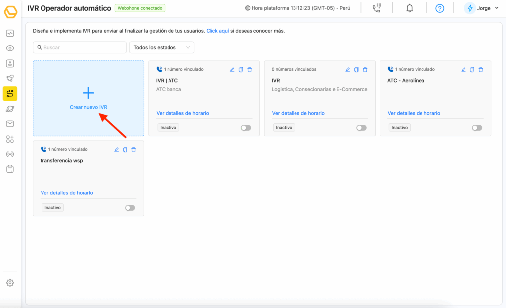 En el panel de IVR Operador automático, haz clic en “Crear nuevo IVR”.