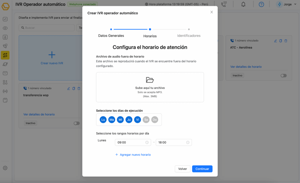 En Horarios, define los días y franjas en que el IVR atenderá (Lu–Vi, 09:00–18:00, por ejemplo).