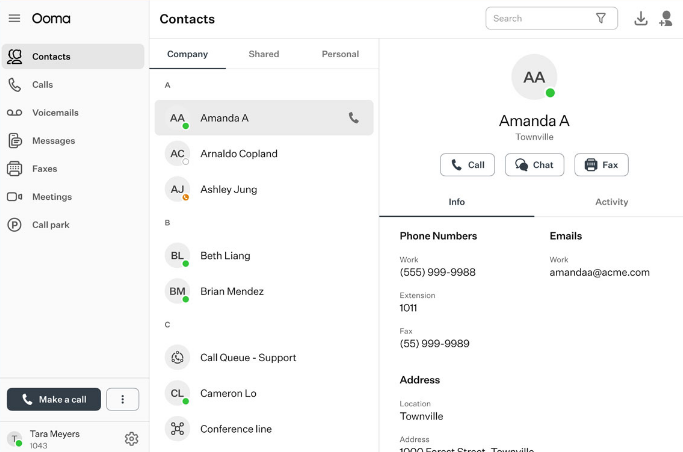 Ooma ofrece servicios de VoIP pensados en pequeñas y medianas empresas. Cuenta con características esenciales como desvío de llamadas, música en espera, y grabación de mensajes de voz.